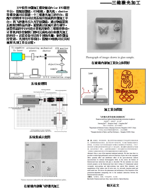 IPP软件3D微加工模块驱动Prior XYZ精密平台,搭配显微镜、CCD相机、激光机、shutter等模块就可以搭建一个三维激光加工的平台,搭配PI的纳米平台可以将系统升级成纳米微加工平台。将飞秒激光引入光学显微镜,通过物镜聚焦后照射到样品内部。能量通过衰减片进行调节。放置样品的平台可由计算机控制作三维精密移动。计算机同步控制快门即可完成电动台和激光加工的同步。这套设