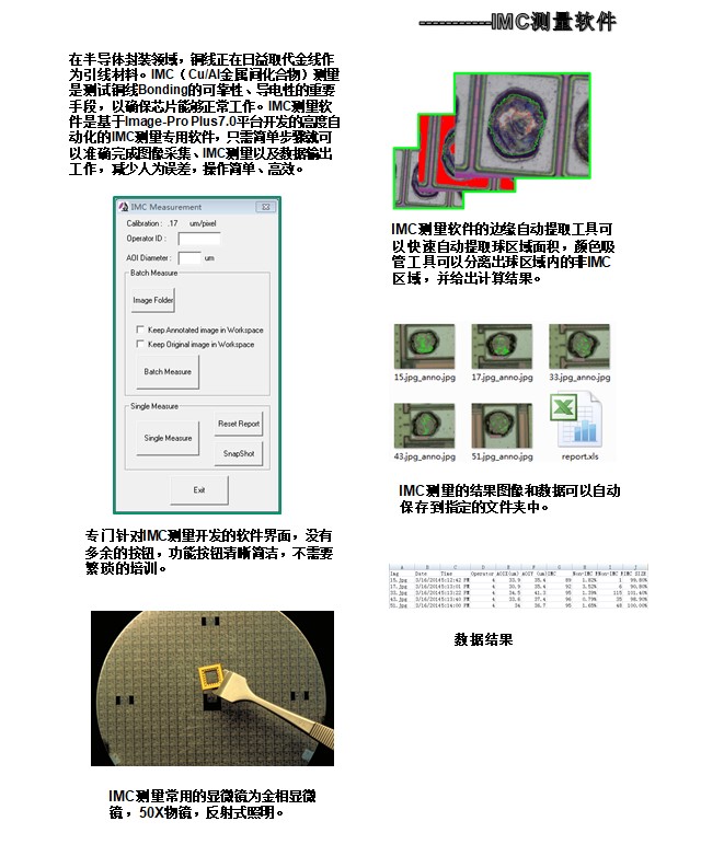 在半导体封装领域,铜线正在日益取代金线作为引线材料。IMC(Cu/Al金属间化合物)测量是测试铜线Bonding的可靠性、导电性的重要手段,以确保芯片能够正常工作。IMC测量软件是基于Image-Pro Plus7.0平台开发的高度自动化的IMC测量专用软件,只需简单步骤就可以准确完成图像采集、IMC测量以及数据输出工作,减少人为误差,操作简单、高效。