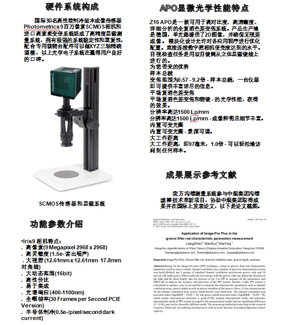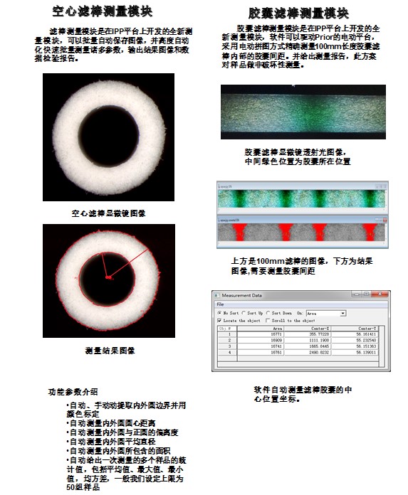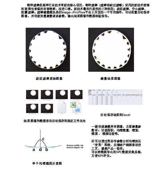 1、波纹滤棒测量模块:特种滤棒是烟草行业技术革新的核心项目,特种滤棒(滤棒俗称过滤嘴)采用的新技术能够有效降低香烟的有害物质,改进口感。新技术最有代表性的三种类型:波纹滤棒、空心滤棒、胶囊滤棒。滤棒测量模块是在Image –Pro Plus平台上开发的一个专用插件,可以批量自动保存图像,并快速批量测量诸多参数,输出结果图像和数据检验报告。