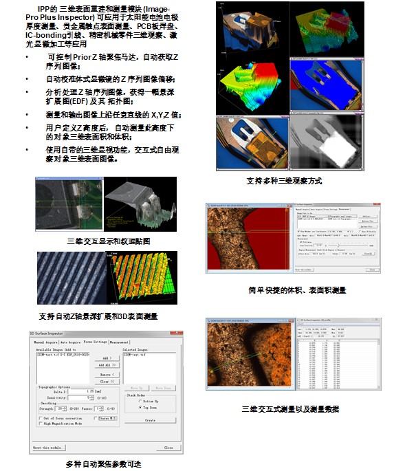 IPP的 三维表面重建和测量模块 (Image-Pro Plus Inspector) 可应用于太阳能电池电极厚 度测量、贵金属触点表面测量、PCB板焊盘、IC-bonding引线、精密机械零件三维观察、激光显微加工等应用。