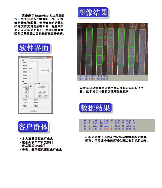 这是基于Image-Pro Plus开发的专门用于导电粒子测量的工具,它能够测量单张图像,也能够自动处理在指定文件夹内的所有图像。测量结果会记录在结果图像上,所有的测量数据和结果图像会自动保存在文件夹内。