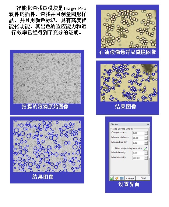 智能化查找圆模块是Image-Pro 软件的插件,查找并且测量圆形样品,并且用颜色标记,具有高度智能化功能,其出色的适应能力和运行效率已经得到了充分的证明。
