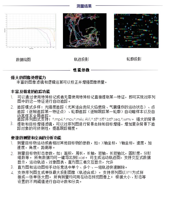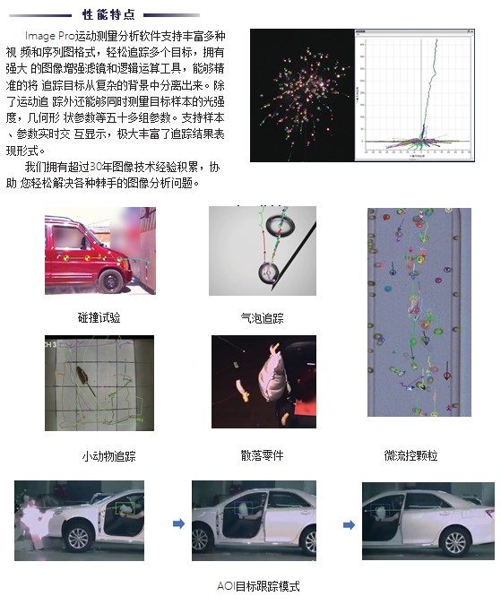 Image Pro运动测量分析软件支持丰富多种视 频和序列图格式,轻松追踪多个目标,拥有强大 的图像增强滤镜和逻辑运算工具,能够精准的将 追踪目标从复杂的背景中分离出来。除了运动追 踪外还能够同时测量目标样本的光强度,几何形 状参数等五十多组参数。支持样本、参数实时交 互显示,极大丰富了追踪结果表现形式。我们拥有超过30年图像技术经验积累,协助 您轻松解决各种棘手的图像分析问题。