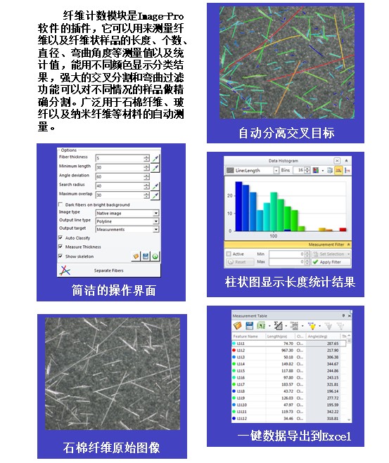 纤维计数模块是Image-Pro软件的插件,它可以用来测量纤维以及纤维状样品的长度、个数、直径、弯曲角度等测量值以及统计值,能用不同颜色显示分类结果,强大的交叉分割和弯曲过滤功能可以对不同情况的样品做精确分割。广泛用于石棉纤维、玻纤以及纳米纤维等材料的自动测量。
