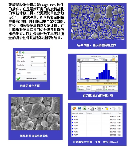 智能晶粒测量模块是Image-Pro 软件的插件,它是最新开发的高度智能化的颗粒计数工具,只需要简单的参数设定,一键式测量,即可将复杂的颗粒准确分割,并且输出单个晶粒面积、直径、周长等测量值以及统计值,并且能够将测量结果自动分级并用颜色标示出来。以往分割计数工具无法测量的复杂图像均能够快速得到结果。